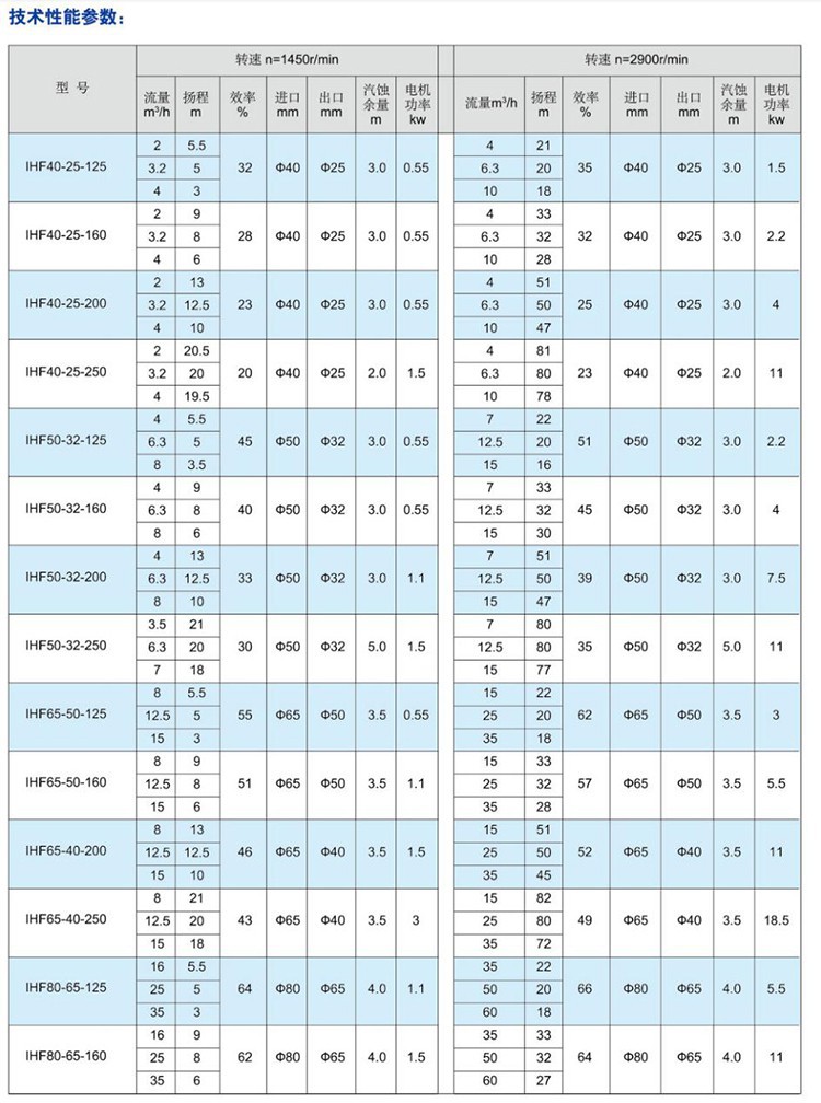 IHF衬氟塑料离心泵为单级单吸式氟塑料合金化工离心泵,是按国标设计并结合非金属泵的加工工艺设计生产的。该泵具有耐腐、耐磨、耐高温、不老化、机械强度高、无毒素分解、使用温度宽等优点,输送介质温度为-85℃~200℃。该泵广泛适用于化工、制药、石油、冶金、电力、电镀、酸洗、农药、造纸等行业中液体输送、废水处理和加酸等工艺流程。本泵可输送任何浓度的硫酸、盐酸、硝酸、醋酸、氢氟酸、王水、强硷、强氧化剂、有机溶剂等强腐蚀性介质的使用,是先进的耐腐蚀装备之一。